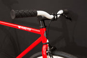 Gloss Neon Red frame with white deep dish wheels.