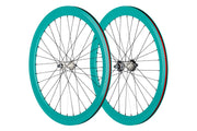 Pure Fix double-walled aluminum wheelsets are size 700C with a 40mm rim depth, front and rear. Our wheels include name-brand and laser-etched KT Quando hubs (100mm front, 120mm rear, 3/8" axle). Our rear wheels include flip-flop hubs with a pre-attached 16T fixed cog along with a 16T freewheel cog for single-speed riding. Our front and rear wheels are 32 spokes each. All wheelsets include nylon rim-strips to protect against sharp edges and prevent tube puncture.